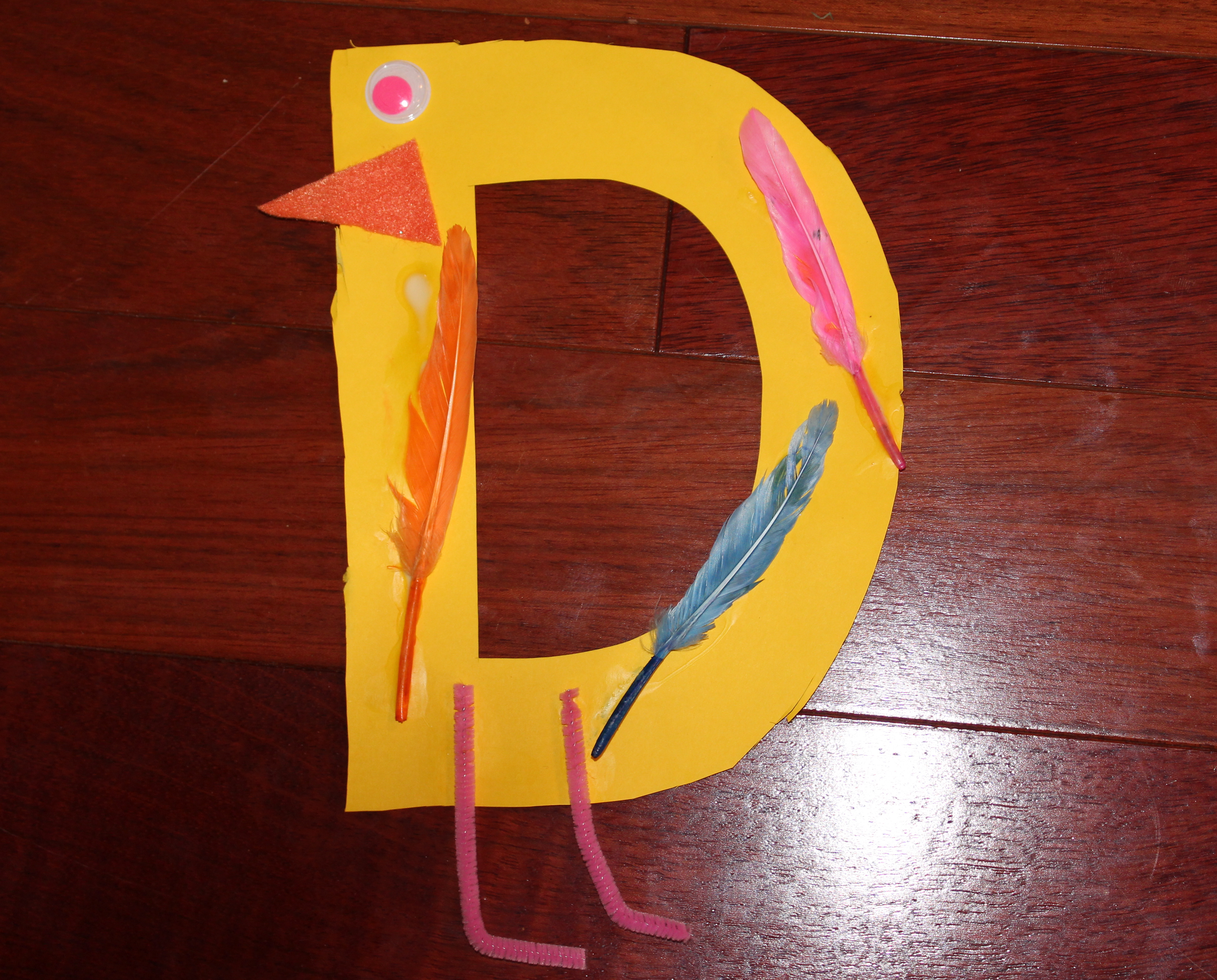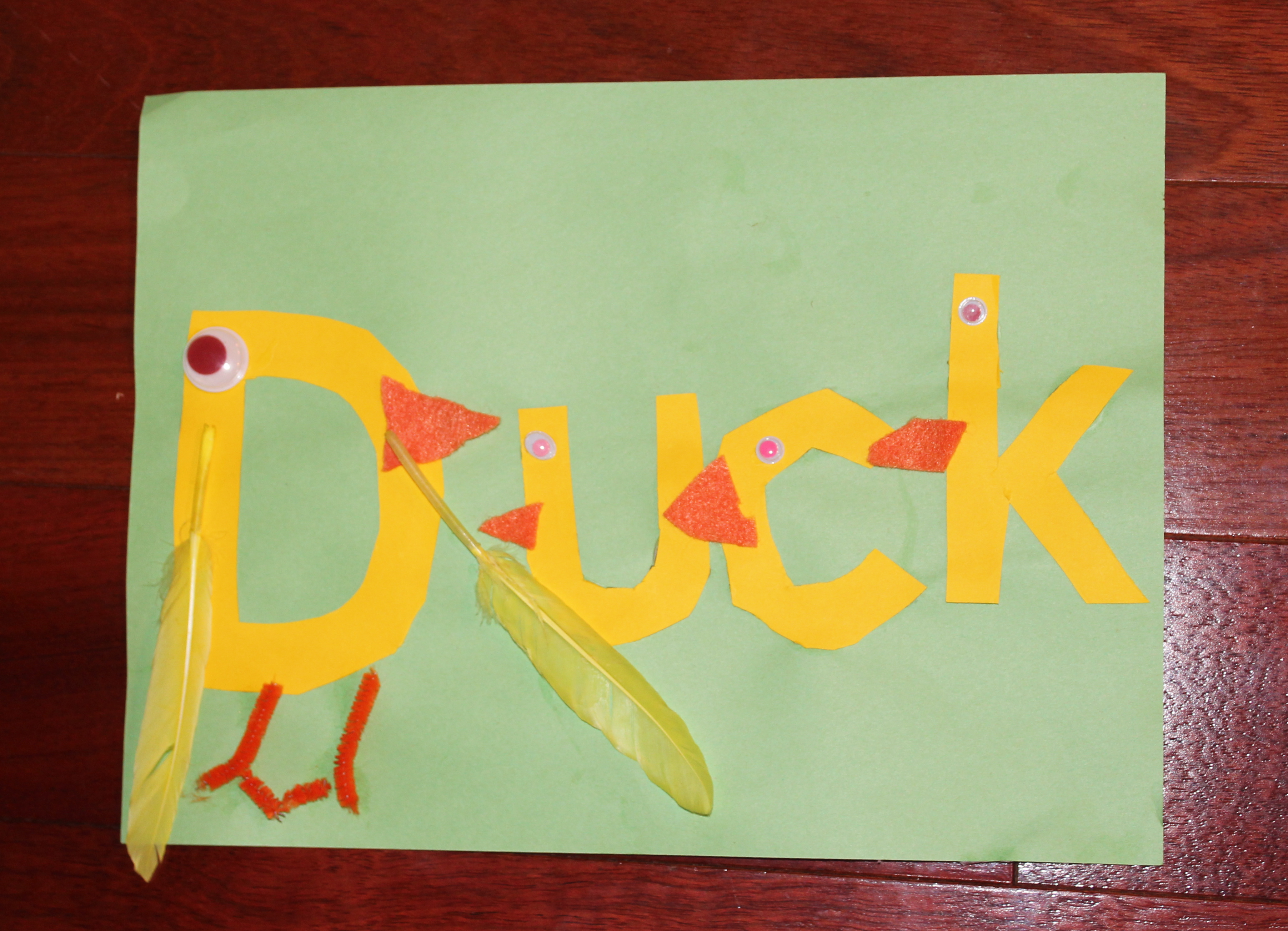 I wanted to tie our crafts from the Readathon to our routine as much as possible so since it was time for us to add a D to our alphabet wall, D for Duck was a perfect fit! We found an idea at Narrating Tales of Preschool Storytime and modified it to make it our own. I printed off Eileen a large D and Kaitlyn all the letters for the word Duck. I had some bright yellow cover stock so this worked perfectly. I had them cut their letters out all by themselves. This was perfect scissor practice for Eileen. She sometimes has very little confidence in herself but with a lot of positive verbal reinforcement she was able to to it out by herself. I cut out the centres of the D for both of the girls. Next we went to the craft centre to see what we could find to make our letters look like ducks. We got out the goggly eyes, orange felt and pipe cleaners. After we started Eileen informed me we needed feathers because ducks have feathers so I managed to find a few in one of the craft boxes. Kaitlyn make her word into a whole family of ducks – very cute!