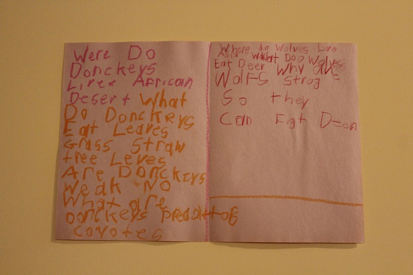 We also had a short talk about making words plural that end in f (eg. wolf – wolves). She seemed to understand it pretty easy. While she was doing her research something interesting popped into my head. The Donkey and the Wolf is an Aesop fable, which are estimated to date back to the 5th century BC. In Kaitlyn’s research she learned that gray and red wolves have lived in Asia, North America, and Europe and maned wolves in South America. She also learned that donkey’s originated in the African Desert and only came to North America until the settlers brought them and George Washington owned the first to be born in North America. So I started to think how could a donkey and a wolf be in the same story written so long ago. Well first I checked to see if there ever were wolves in Africa and learned of the Ethopian wolf that looks more like a red fox. I then checked out when donkeys were first domesticated and found that it was at least 5000 years ago. My guess is that the fable is about a wolf and a domestic donkey in Europe. That is an example of me over analyzing everything!