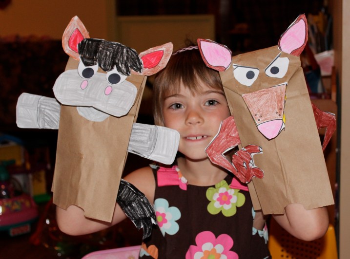 I was going to leave it at that but the girls decided that since we read a book we had to do a craft. They are into putting on plays and shows right now so we decided to make puppets. I only have so much creativity so I used google and found templates at DLTK teach. I downloaded and printed off the templates for both the wolf and the donkey. I let the girls decide which colours they wanted to colour and they cut out all the pieces, and then I glued them together for them. Hours of puppet show adventure await!