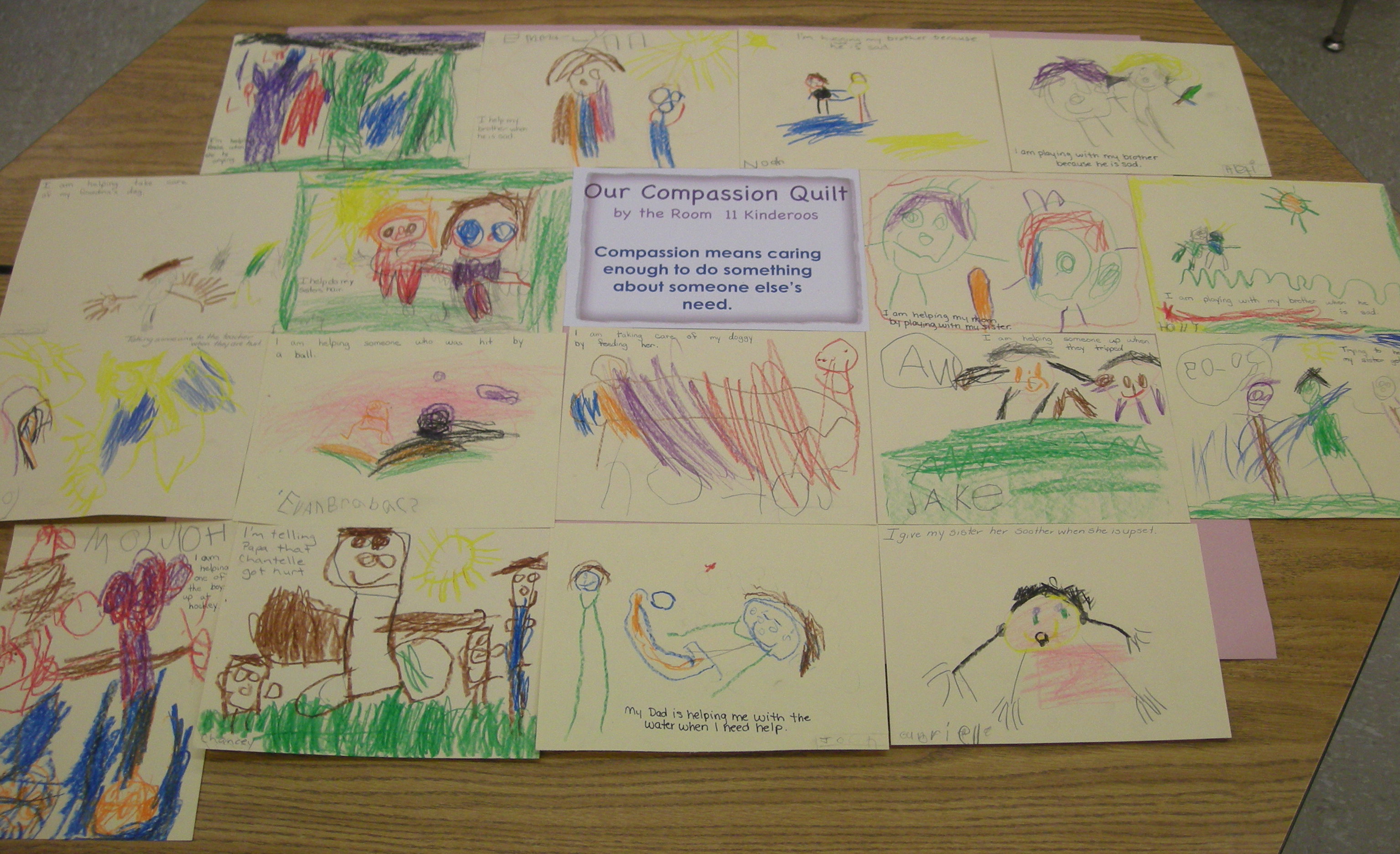 Today we reviewed The Brand New Kid and I read them Grady the Goose by Denise Brennan-Nelson. I borrowed this book from my teaching partner and it was perfect on many levels. We are studying migration and today specifically we were looking at the Canada Goose, but in terms of compassion the farmer in the book shows compassion to Grady by freeing her and taking her to her family. After this I introduced the compassion quilt to them. Each student was given a small square of paper and they each had to draw a picture of someone showing compassion. To make sure they knew what they were going to draw I had them tell me before I gave them their paper. This gave me the opportunity to clarify their answers and make sure they understood the concept of compassion. When they were done they had to bring their square to an adult in the room (myself, my EA or one of my volunteers) and we wrote their sentence for them describing their picture. At the end of the day I glued them all together on a large bristol board, and I am VERY happy with how the finished product turned out!
