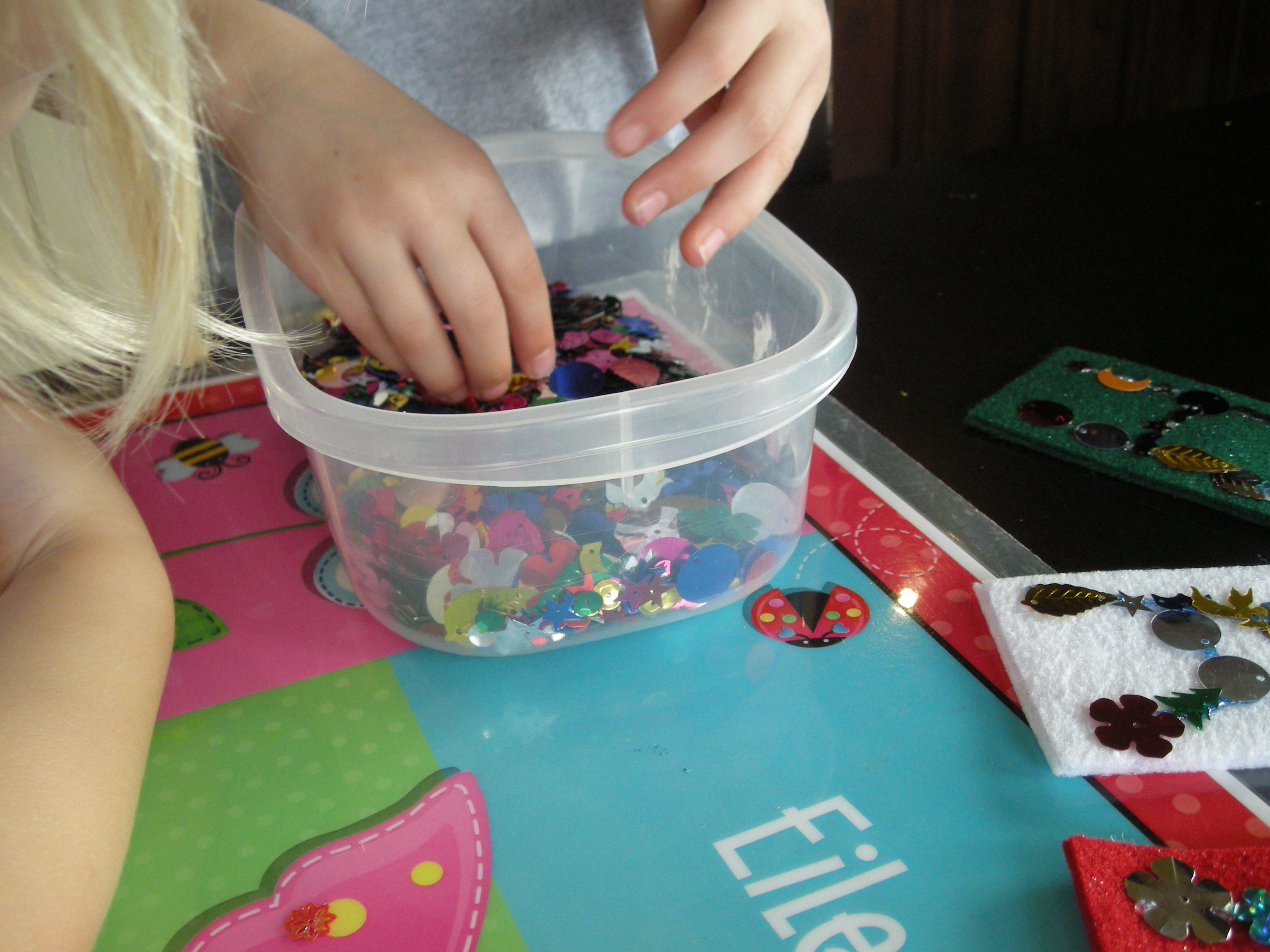 I cut the strips out as the instructions listed and glued them on the string. I found that they kept sliding with white glue so I used hot glue to make sure it would stay together. The next day I sat down with the girls to make our banner. I used the glitter glue to print each letter in uppercase and they put the sequins on. At first I tried to get them to use small sequins but after a few minutes I abandoned that battle and let them do it however they wanted.