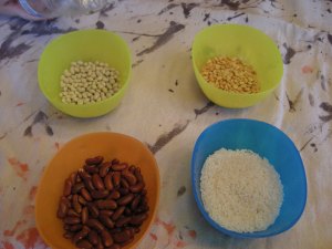 We found a cute idea at Kibmoou. We first called Gramma to bring over any empty water bottles, we didn’t have any. She brought over a few different types and we picked the Gatorade and Powerade bottles because they had the biggest openings. I went through my pantry and picked out a number of things that would make noise in a bottle: navy beans, rice, white beans and split peas. I put a small amount in 4 bowls and told the kids they could experiment to see what filler would make the sound they liked best.