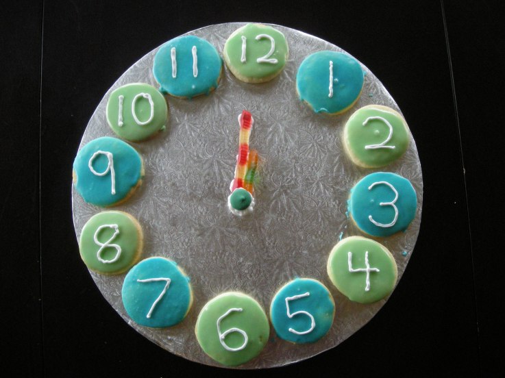 I had PVRd this movie when it was on a couple of days earlier thinking the girls might like it. It seems like all the good kids holiday specials are always on after the kids go to bed! For a couple of years now I had been looking for a New Years show I remembered watching as a kid about a New Years baby and as soon as it started I knew this was the one. This special starts right after Christmas when Santa gets a letter from Father Time telling him that Happy the New Years Baby has gone missing – and of course the only one who can find him in a snow storm is Rudolph. Rudolph sets off and meets a number of new characters along the way in his search for Happy. As an adult watching it there are so many inconsistencies that in history that it made my head want to spin. For some reason I don’t have a problem with the more traditional tales and a flying red-nosed reindeer but a number of islands where the Father Time of each year goes to retire is a bit far fetched for me. Kaitlyn actually asked me while we were watching it if the cavemen really lived at the same time as the dinosaurs (because of course they do on island 1 000 000 BC). I did really like the use of time in the film in many of the characters. This is a concept we have been working on and led us to decide we needed to make a special treat for New Years Eve. The girls are going to a party with the cousins at Grandmas so we decided to make a cookie clock for them to take.