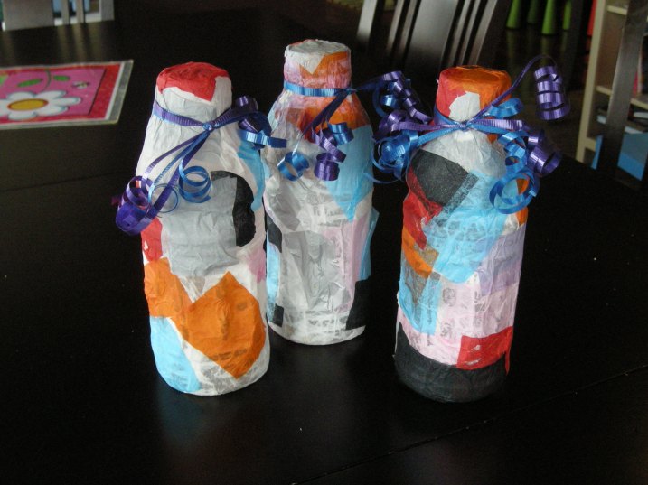 We took off the labels and got started with the decorating. This style of decoration is very easy at this time of year because we had so much tissue paper from Christmas presents. First I gave them scraps of white tissue paper. They each covered their bottle by gluing on the tissue paper using glue I had diluted in water. They would lay the paper down and brush the glue on with a paint brush. We let them dry a little, not completely and then I gave them a bowl of mixed colour tissue paper and let them make their designs all over their shakers.