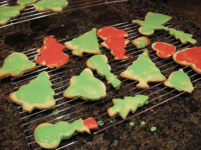 We started by making a batch of soft sugar cookies. We had a recipe from allrecipes.com that we had used to make our reindeer cookies a few weeks ago, and they worked really well, so we used it again. You could easily use refrigerated cookies dough from the grocery store. Since this was an experiment and we weren’t sure how it would turn out we decided to simply make them circle shaped. We have an awesome box of 101 cookie cutters that has a number of circle cut outs so we picked the size we thought would work best. After chilling the dough for a couple of hours the girls helped me cut them out and bake them. I let them cool overnight and then I made a glaze using another recipe I found at allrecipes.com. This recipe made enough for the cookies we needed for our clock but not for all the cookies we had made. I made two batches of glaze – one in blue and one in green. All I did was dip each cookie in the glaze and then let them dry. After they were dry I used some buttercream icing and piped on the numbers. The girls picked gummy worms for the arms of the clock and I used a chocolate wafer for the middle. You could also use liquorice. It helped to secure the arms with some more icing.