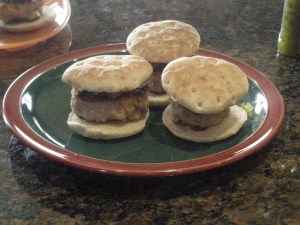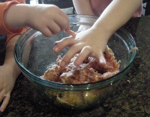 Our main course was Mini-Turkey Burgers. They were very yummy, very easy to make, and the perfect size for tiny hands. I thought it would be fun for the girls to get their hands in the mixture and make the burgers themselves but they were too worried about getting their hands messy. Whenever cooking with kids make sure they wash their hands before and after touching anything. This isn’t usually a problem in our house, the problem is usually the bathroom flooding! The only thing difficult to find in this recipe was the mini buns. Gramma came to the rescue again and found Slider Thins Mini Burger Buns made by President’s Choice. It was nice having thin buns as we could make our burgers a bit thicker an they were still not too large for little mouths.