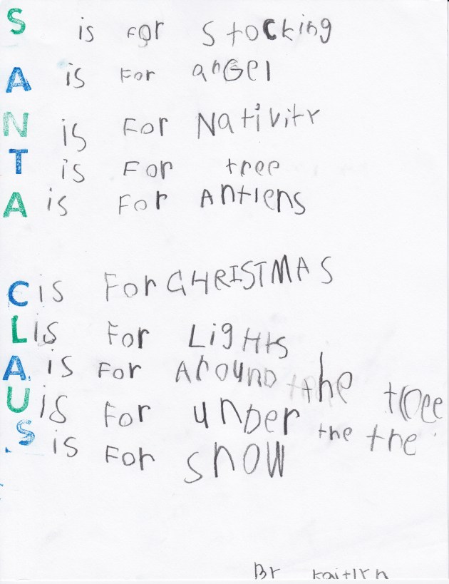 Kaitlyn’s activity was to write her own acrostic poem. We have not done any poetry at home yet but she loves to write so I knew she would like this activity. I first asked her to pick a Christmas word or phrase and she came up with ‘Santa Claus’. I thought this was the perfect length for her and not too long. She wrote the letters down the left hand side of her page and we decided to write ‘is for’ after each letter to make it easier for her to write and read. She got stuck on a few letters but the only one Mommy had to give her was nativity for the letter N. After she was done her rough copy she stamped out the word Santa Claus (it was her idea to do the colour pattern) and then neatly printed her poem. I think she did an awesome job!